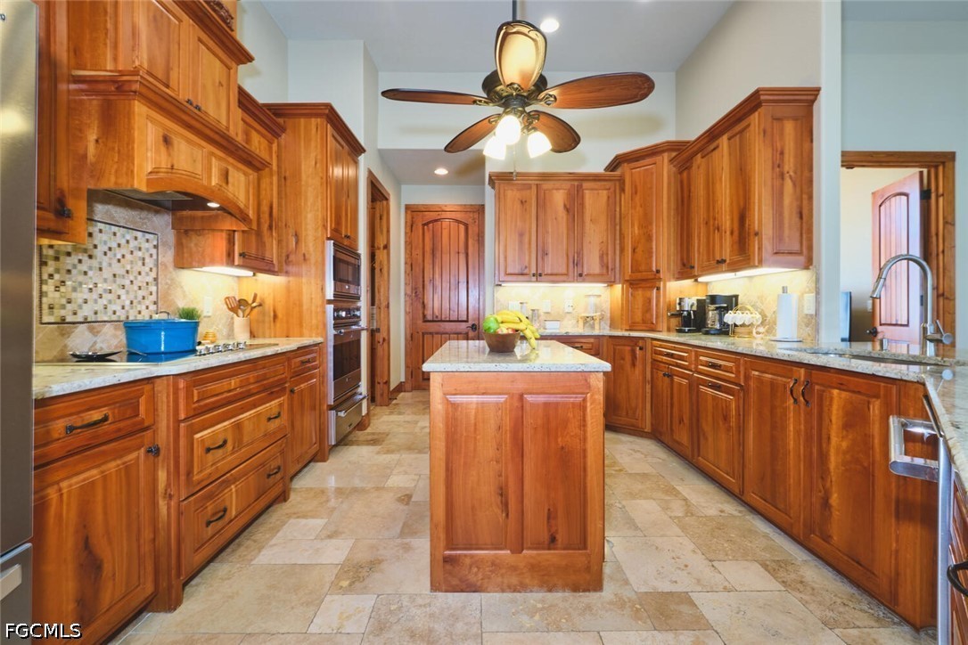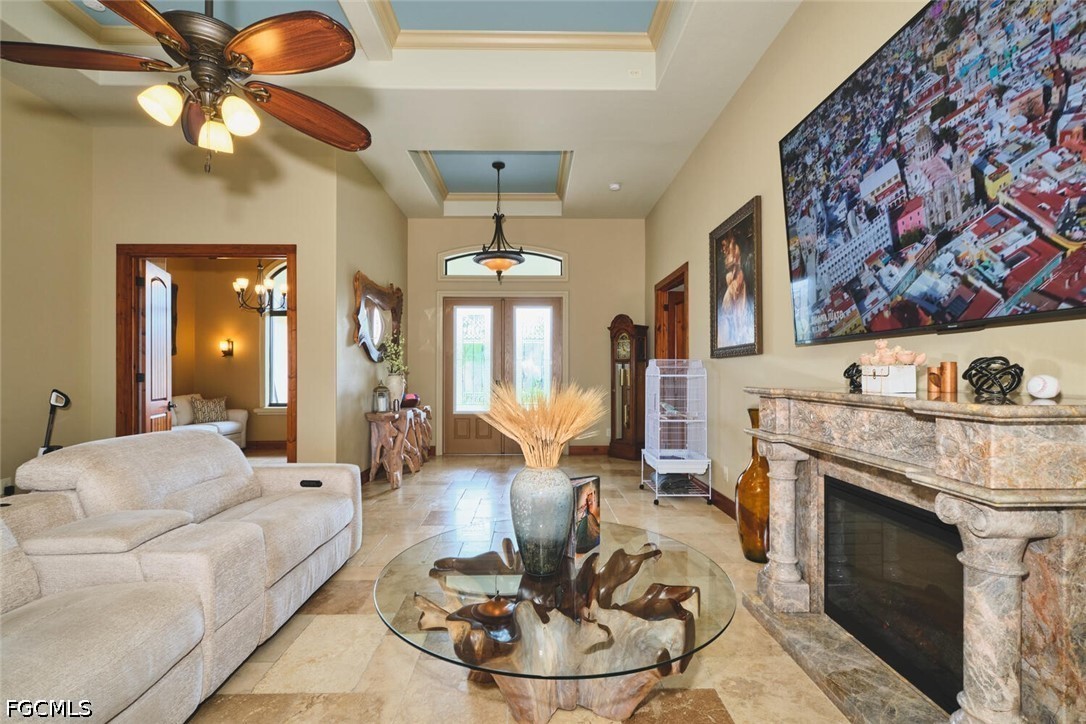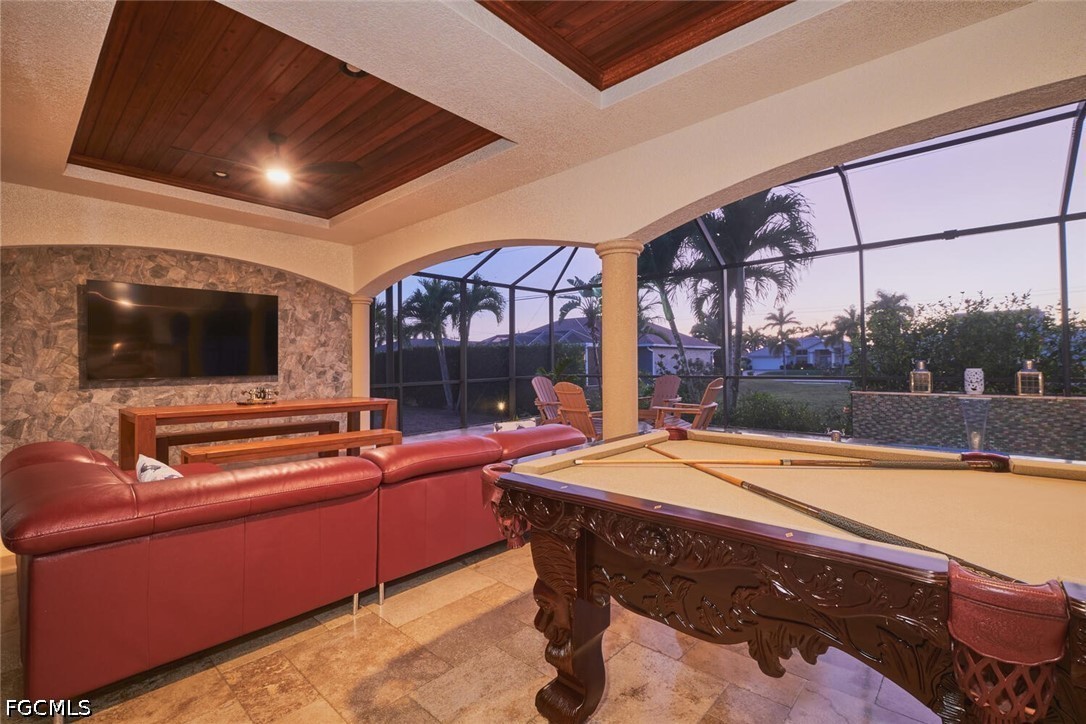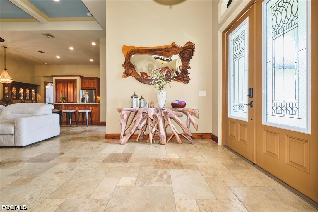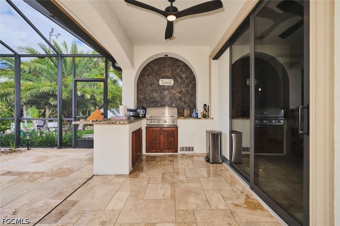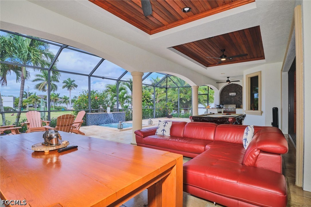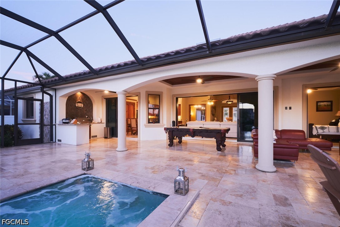 This is a DREAM HOME in one of the most sought-after locations, featuring a total built area of 4,350 square feet, constructed with luxury features, superior quality, and meticulous attention to detail. The home boasts 14-foot ceilings, foam insulation, 3 bedrooms plus a dedicated study, 2 bathrooms finished entirely in travertine, and an oversized garage with space for more than two cars and a separate tool room. This beautiful residence features upgraded cherry wood cabinetry with granite countertops, a high-end appliance package, and a spacious living area. Travertine flooring extends throughout the entire home, including the outdoor living spaces. The interior is adorned with crown molding and custom millwork throughout; the master suite includes a walk-in shower with direct access and a jetted soaking tub. Outdoor amenities include a large, heated Jacuzzi with a saltwater system, an oversized lanai, and a full outdoor kitchen. Additional features include a tile roof, an expansive paver driveway, and pocket sliding glass doors that recede completely into the walls to seamlessly blend indoor and outdoor living spaces. The home is equipped with impact-resistant windows and sliding doors; the pool enclosure screen was installed in 2026, and the air conditioning system was installed in 2022. The sale includes all home furnishings—valued at over $50,000—and the adjacent rear lot is also available for purchase, offering an excellent opportunity to expand your property and make your estate even more expansive. All municipal water and sewer assessments have been paid in full. Conveniently located near the Cape Harbour Marina, as well as local restaurants and shops!