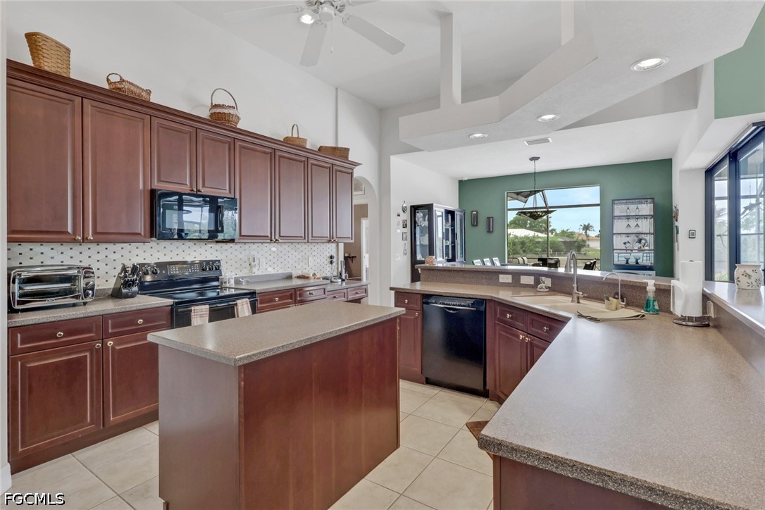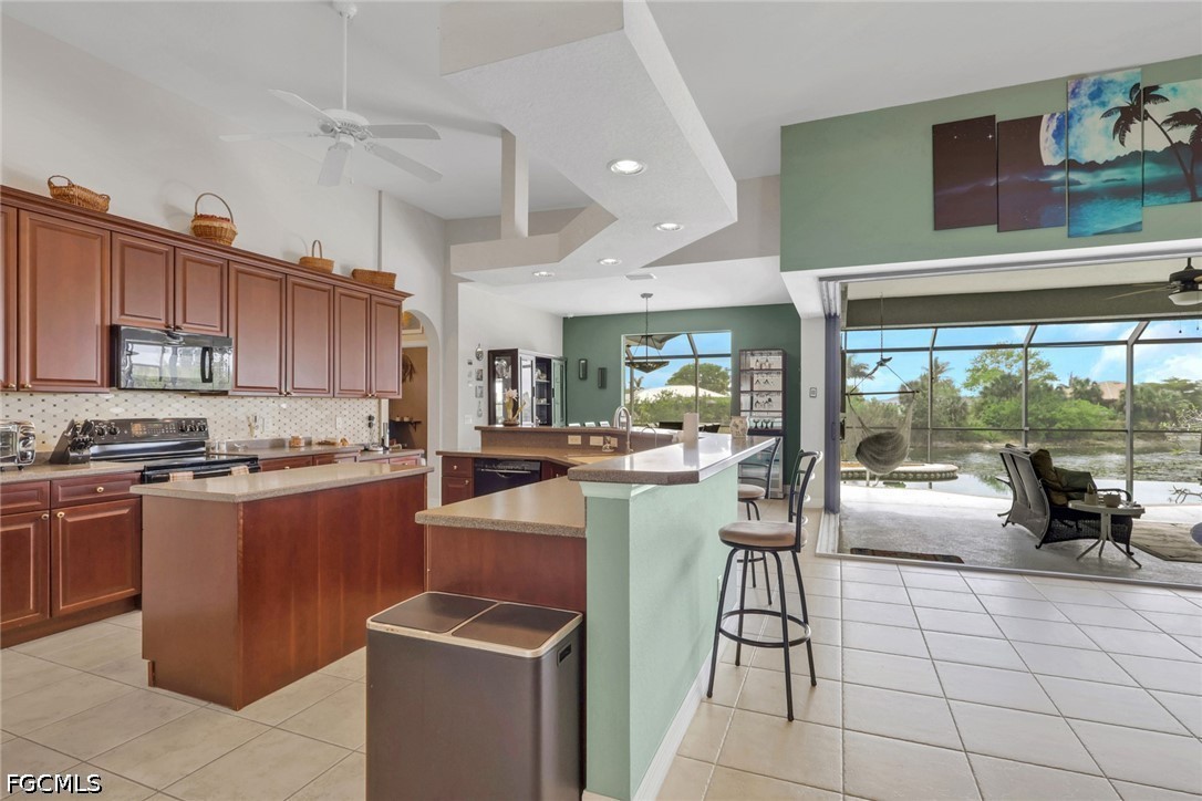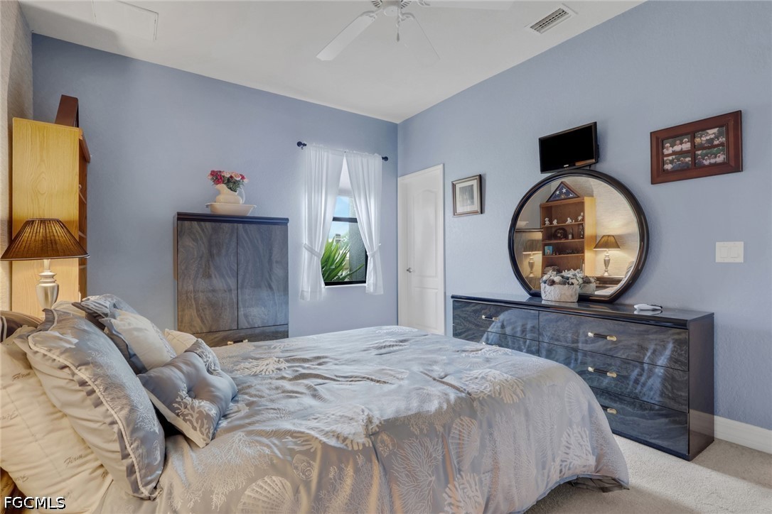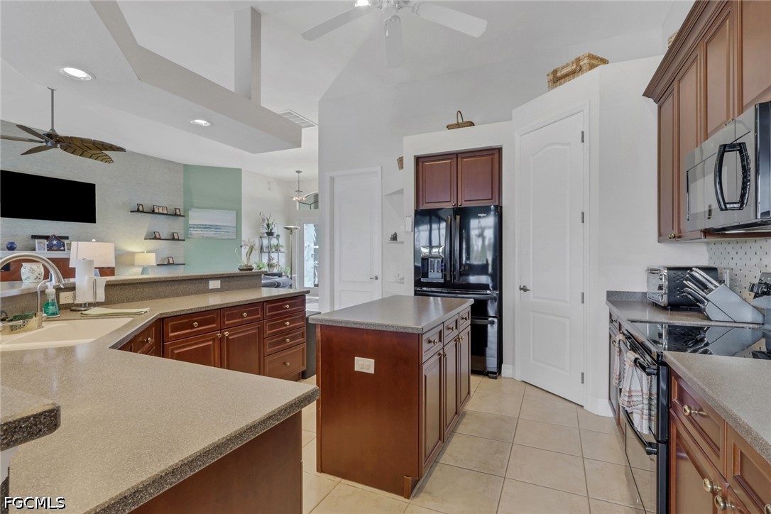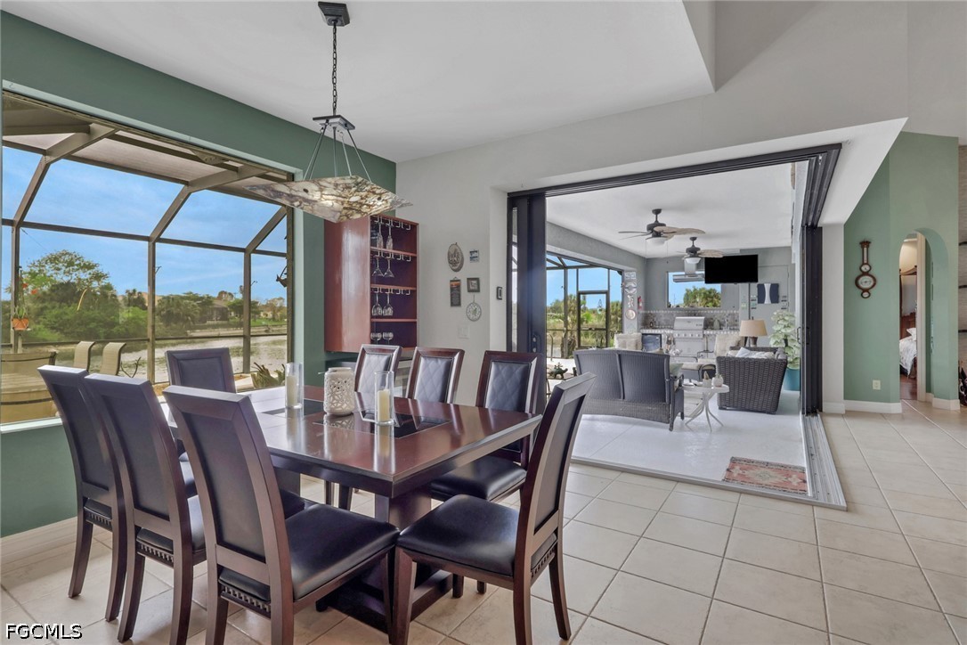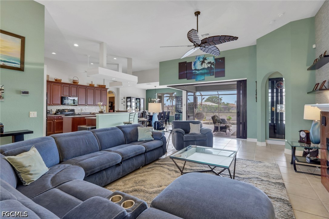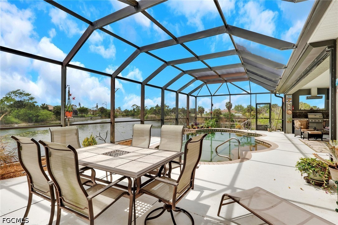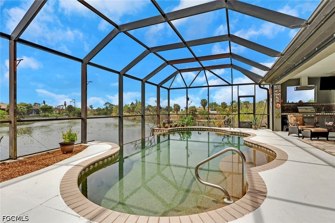 NO FLOOD ZONE. South Western rear exposure Custom Hallmark built by Aubuchon Homes. This 3 bed plus den, 3 full bath, 3 car garage is on an oversized pie shaped lot (158 feet of seawall!) on a beautiful fresh water lake. Exquisitely maintained Custom home with new tile roof 2019, new A/C 2019 (with UV Sterilization light), Fridge 2026. The large under truss lanai is the perfect place to entertain family and friends while enjoying the weather. Heated salt water pool has an infinity edge that perfectly matches the lake and just draws you into as it goes on forever. Lanai area features power storm shutter screen and summer kitchen. Rest of the home has hurricane screen for the windows. The pool bath is shared with the 3rd bedroom as an ensuite bath. Inside the Great Room designed home you'll find soaring ceilings and a pocketing 90 degree sliding glass doors to the lanai and pool areas. Large open kitchen over looks the great room, another great place to gather with friends and family. Solid surface counter tops, custom tile backsplash, and custom hardwood cabinets with crown molding offer plenty of storage. Owner's suite starts with a private entrance, an Aubuchon signature feature, pocketing sliding glass doors to the lanai, large walk in closets, dual vanities, walk in shower and soaking tub. 3rd bedroom features ensuite bath, which is also the pool bath, transom window for natural light and privacy and French doors to the lanai and pool area. Outside is large 3 car pavered driveway, mature tropical landscaping, established floritam lawn with automatic irrigation system. 5 Wall mounted TV's stay.