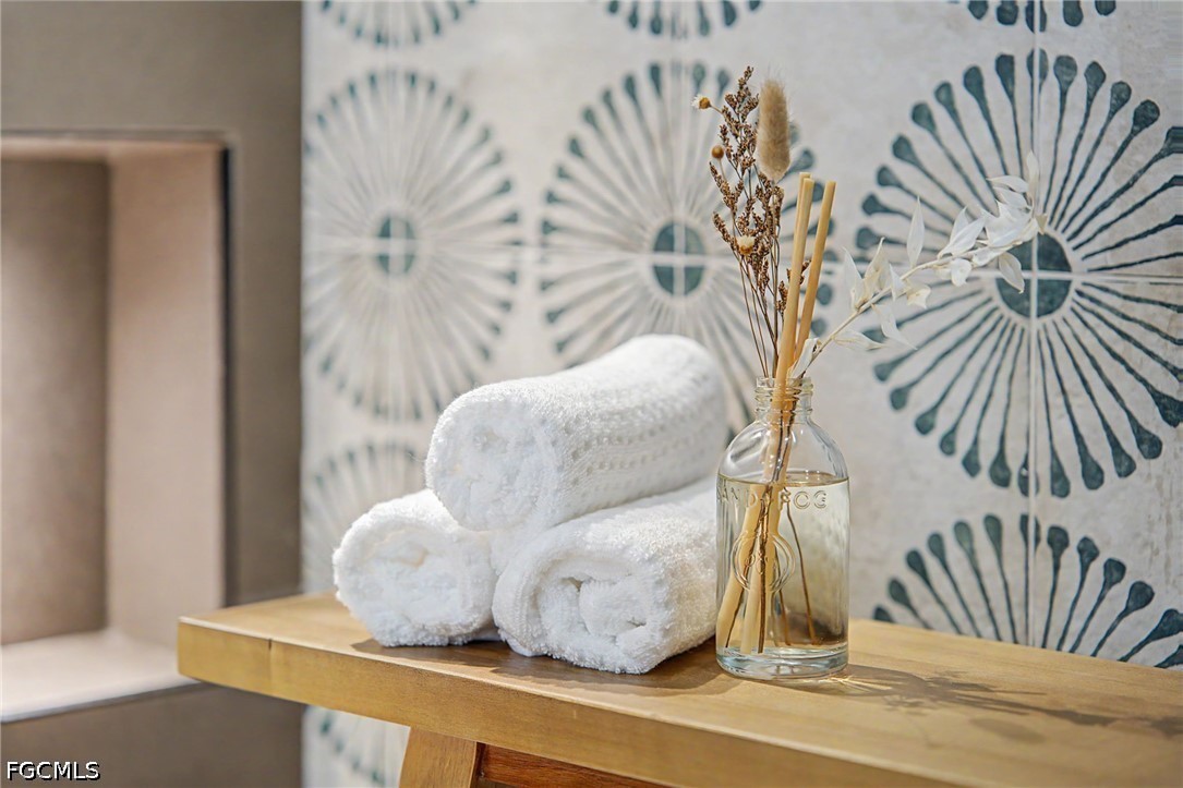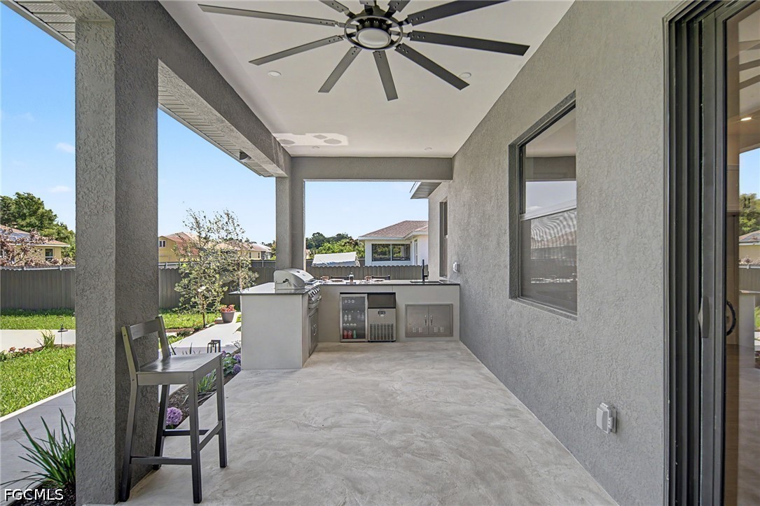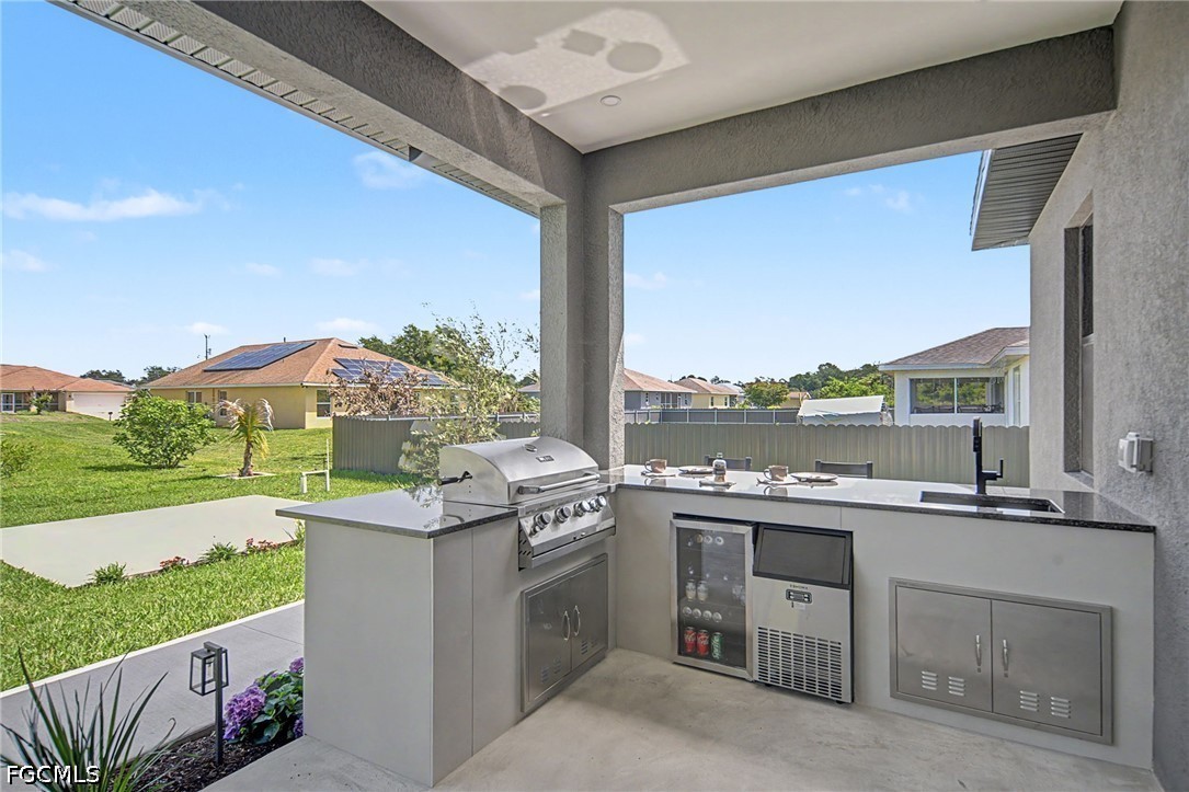 The elegance flows effortlessly outdoors to a private sanctuary featuring a full outdoor kitchen, a convenient outdoor half-bath, and a large concrete pad already in place and ready for your custom pergola. The expansive backyard offers plenty of room for a pool, creating the perfect canvas for your dream outdoor oasis. The exterior is equally refined, featuring Florentine grass and a professional system of low-voltage landscaping lights that beautifully illuminates the exterior, all maintained by a full irrigation system with a dedicated, separate line for the luxurious landscaping.