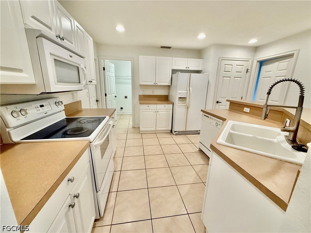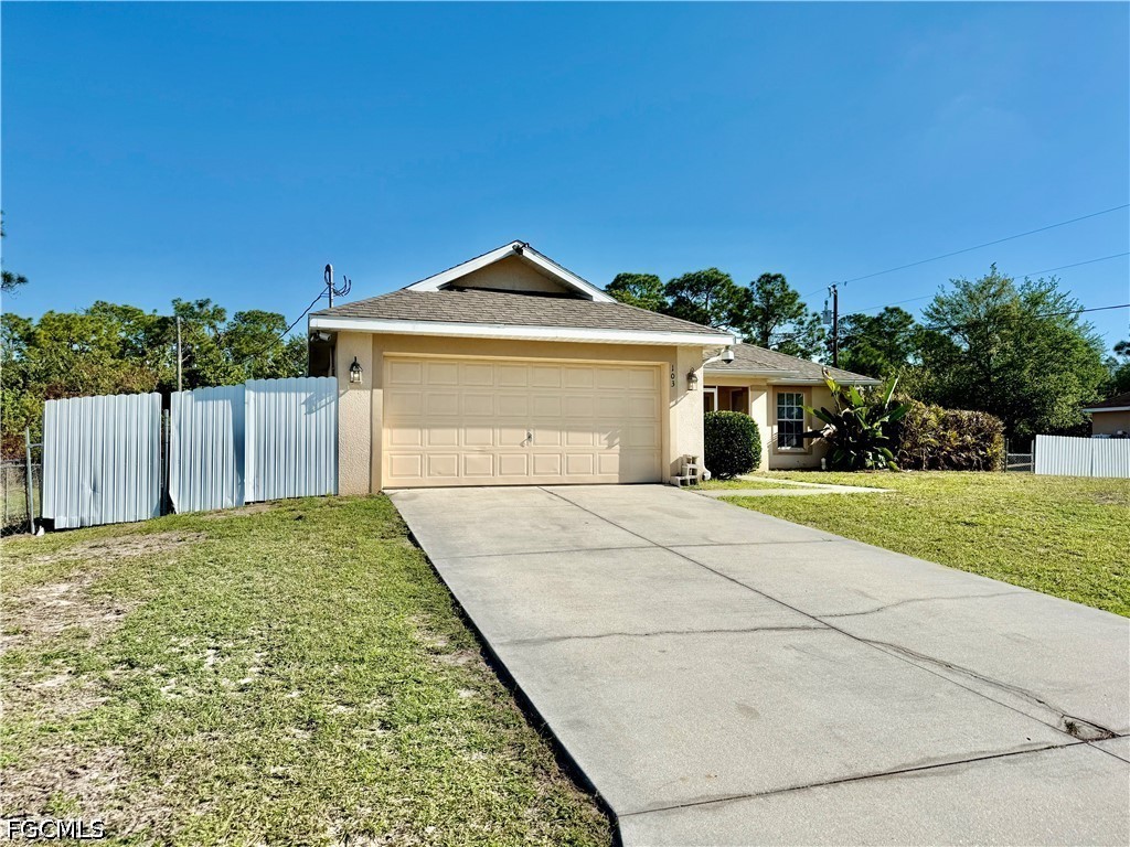 Affordable 3 bedroom 2 bath home with a double garage, FENCED BACKYARD, double gate on one side for additional RV, truck or boat parking inside the fenced area, NEW DIMENSIONAL SHINGLE ROOF IN 2024, NEW CENTRAL HEAT AND AIR IN 2025, NEW WATER HEATER IN 2020, screened front porch, cathedral ceilings and plant shelves, wood floors in the living area with ceramic tile in the kitchen, baths and indoor laundry room, breakfast bar and pantry in kitchen with all kitchen appliances, primary bedroom with walk in closet and private bath with dual sinks, long vanity and walk in shower, built in desk in between the two guest bedrooms, double garage with opener plus laundry tub, sliding doors from the main living area to the 29 X 10 screened lanai overlooking the backyard plus a 19.5 X 8 open patio, plenty of room for entertaining, excellent location just minutes to I-75, Ft Myers and the SWFL International Airport. NO FLOOD INSURANCE REQUIRED. LEHIGH IS THE HIGHEST ELEVATION IN LEE COUNTY.
